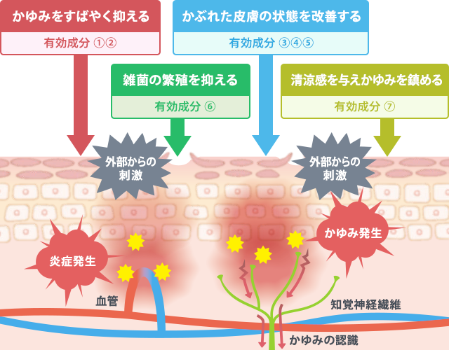 かゆみ止め成分と局所麻酔成分がかゆみをすばやく抑え、殺菌成分が雑菌の繁殖を抑えます。抗炎症成分が患部の炎症を鎮め、血行促進成分が患部の血行をよくし、かゆみや炎症の改善に役立ちます。